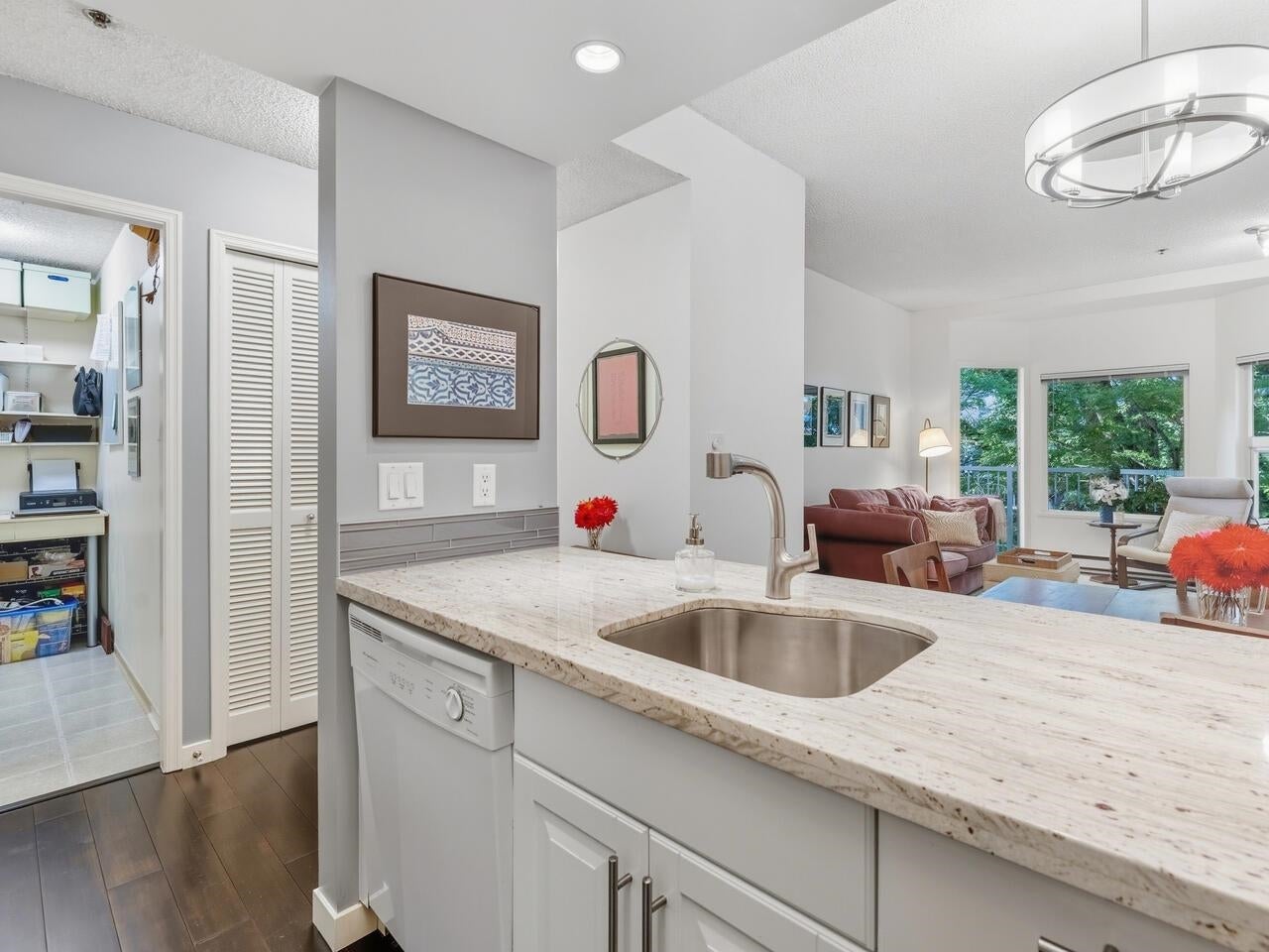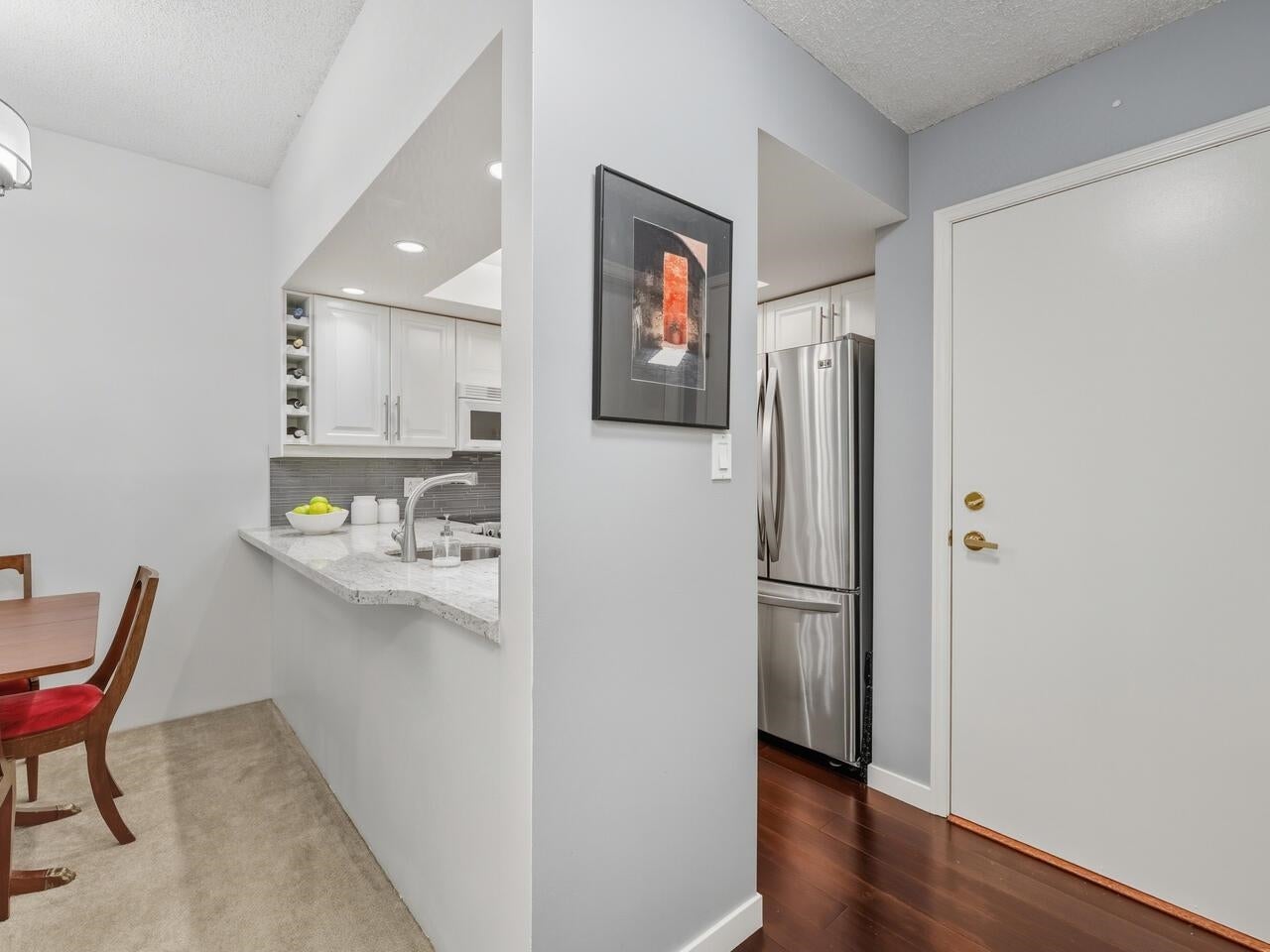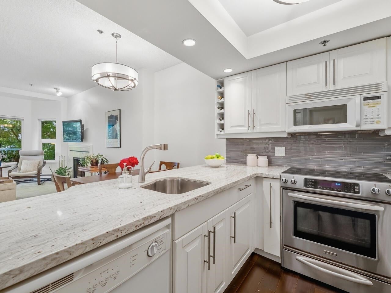 Finally, a well laid out and spacious Kitsilano condo! On the third floor, with no unit above, on quiet, tree-lined 7th Avenue. With a fully renovated kitchen and brand new bathroom, it shows beautifully. Contemporary countertops, high gloss cabinetry, bamboo flooring in the entry and kitchen, and freshly painted throughout. No wasted space, features a large open concept kitchen, dedicated dining area, bedroom easily fits a king size bed, cozy real wood burning fireplace, and patio in the trees - it's the perfect kits condo. A Short walk to the shops on 4th Ave, the beach and Broadway - great walk score, and includes parking and storage. Well maintained building has been rainscreened, and repiped. Elevator renewal is paid for. Offers Sept 23 at 12:30pm.