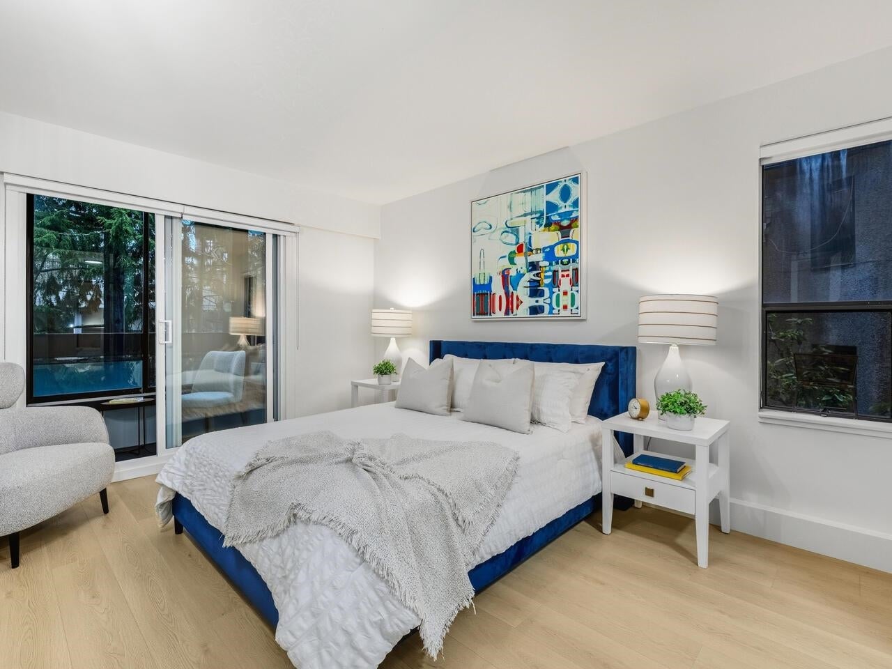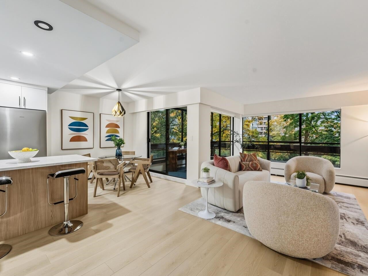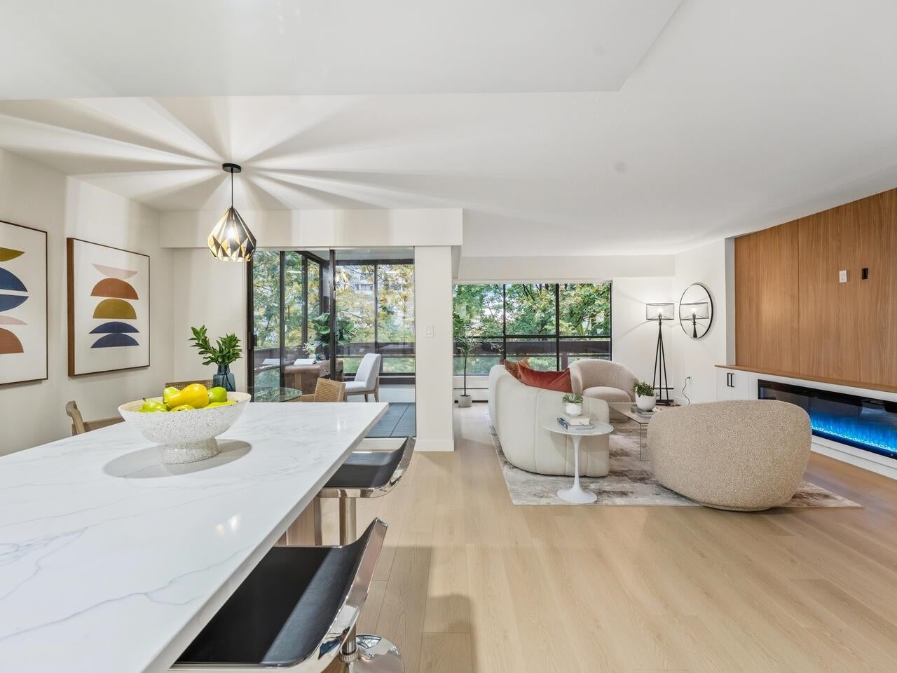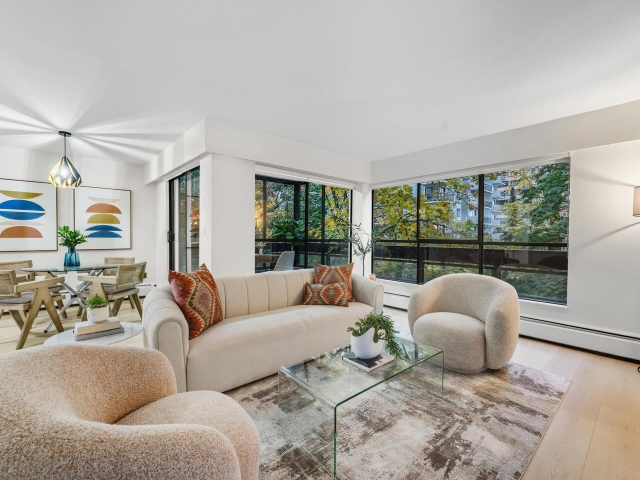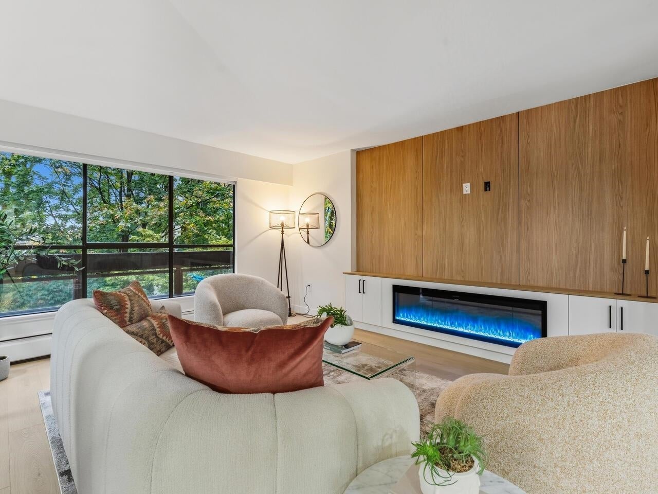 STUNNING RENOVATION! Every inch of this home shows like brand new. Two tone contemporary cabinetry and millwork, gorgeous electric fireplace, wide plank wood grain laminate, quartz countertops, brand new appliances, side by side laundry, upgraded lighting and window shades - the list goes on and on. With just two suites per floor, light pours in from windows on three sides. Measures at nearly 1000 square feet not including two enclosed patios, there is loads of room for living and entertaining. On a whisper quiet treelined street and a short walk to west end shops, restaurants and the beach, a peaceful, vibrant live awaits. Solid concrete building features EV charging, a generous contingency fund, parking and storage, dogs and cats allowed. Open House Sunday October 26 from 2:30pm-4pm.