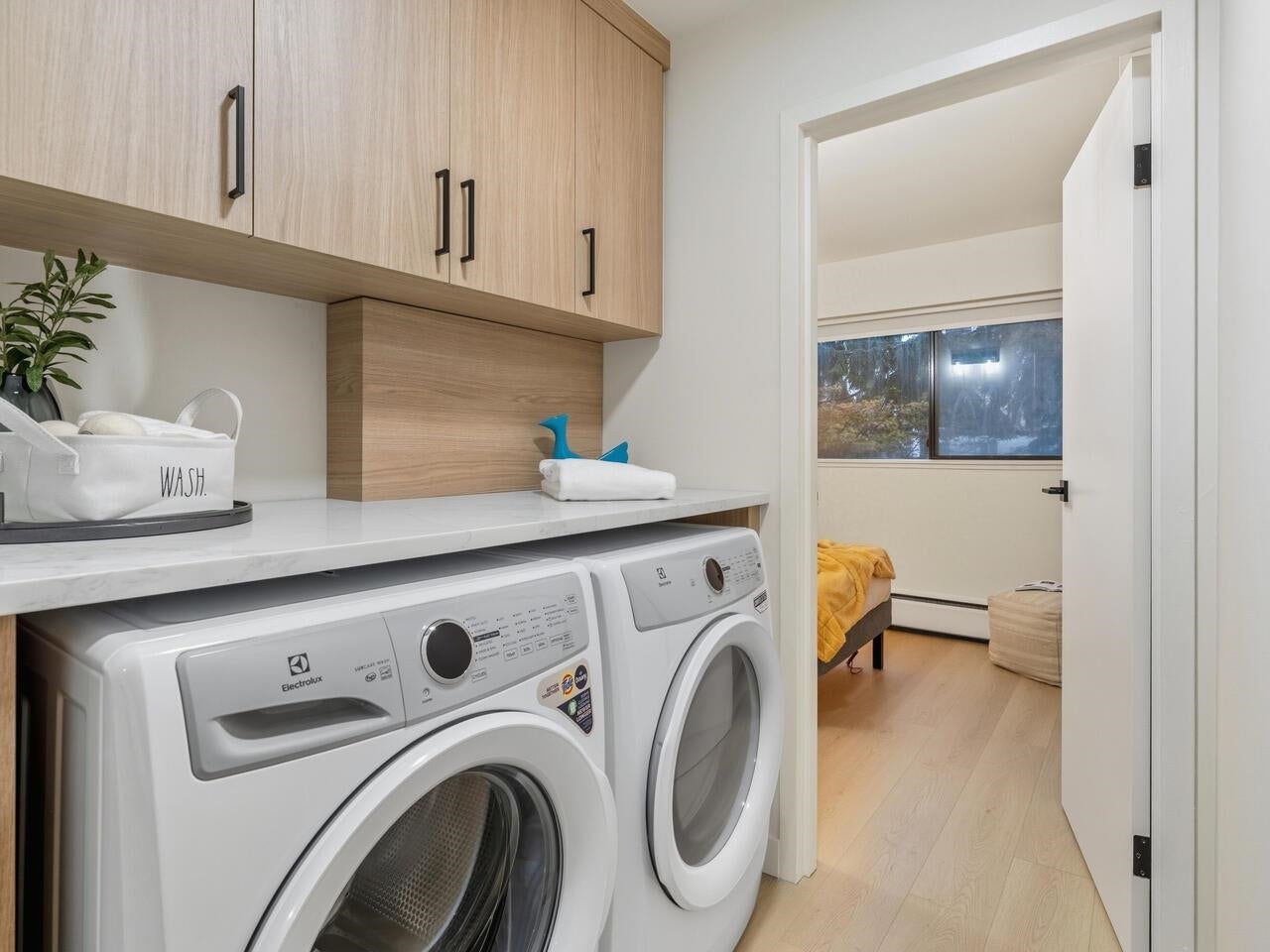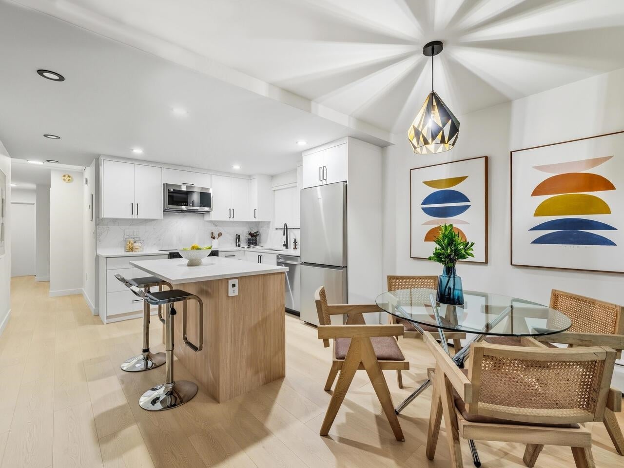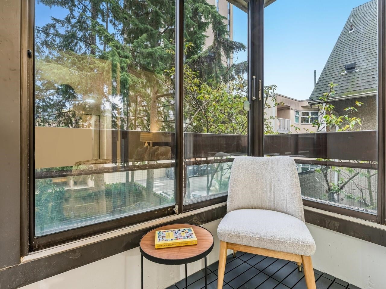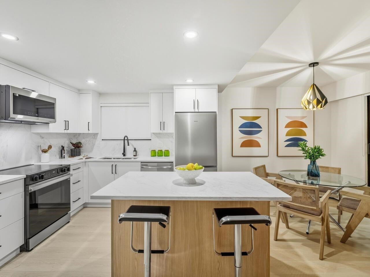 STUNNING RENOVATION! Every inch of this home shows like brand new. Two tone contemporary cabinetry and millwork, gorgeous electric fireplace, wide plank wood grain laminate, quartz countertops, brand new appliances, side by side laundry, upgraded lighting and window shades - the list goes on and on. With just two suites per floor, light pours in from windows on three sides. Measures at nearly 1000 square feet not including two enclosed patios, there is loads of room for living and entertaining. On a whisper quiet treelined street and a short walk to west end shops, restaurants and the beach, a peaceful, vibrant live awaits. Solid concrete building features EV charging, a generous contingency fund, parking and storage, dogs and cats allowed. Open House Sunday October 26 from 2:30pm-4pm.