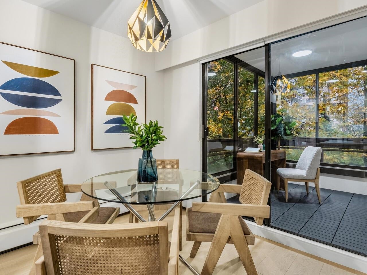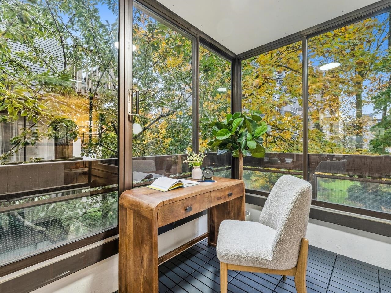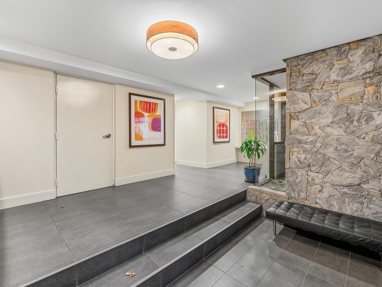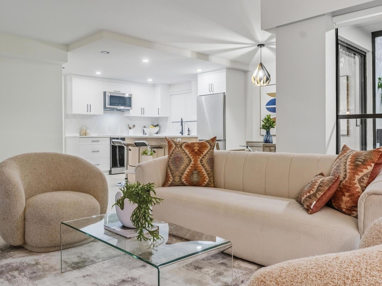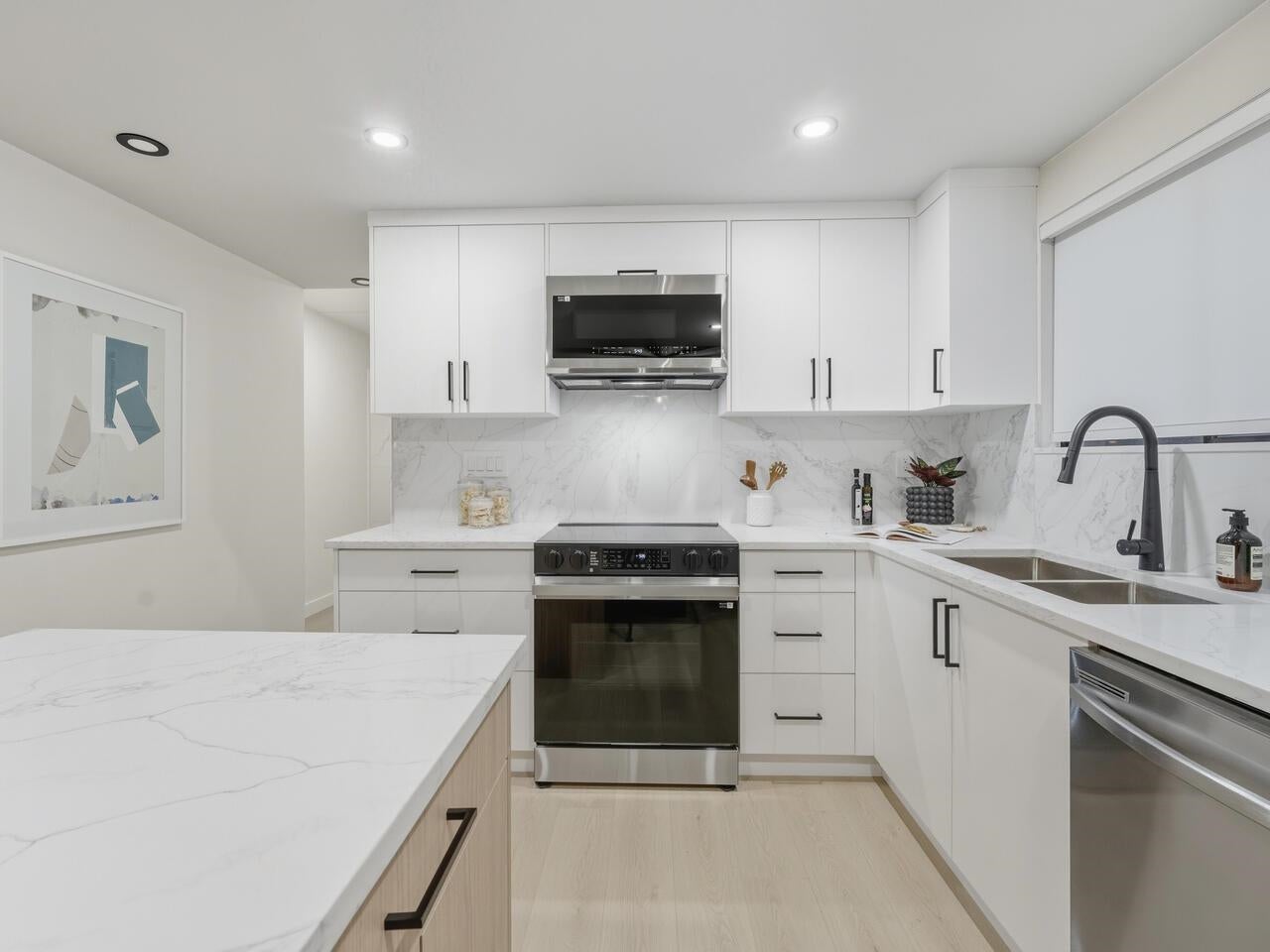 STUNNING RENOVATION! Every inch of this home shows like brand new. Two tone contemporary cabinetry and millwork, gorgeous electric fireplace, wide plank wood grain laminate, quartz countertops, brand new appliances, side by side laundry, upgraded lighting and window shades - the list goes on and on. With just two suites per floor, light pours in from windows on three sides. Measures at nearly 1000 square feet not including two enclosed patios, there is loads of room for living and entertaining. On a whisper quiet treelined street and a short walk to west end shops, restaurants and the beach, a peaceful, vibrant live awaits. Solid concrete building features EV charging, a generous contingency fund, parking and storage, dogs and cats allowed. Open House Sunday October 26 from 2:30pm-4pm.