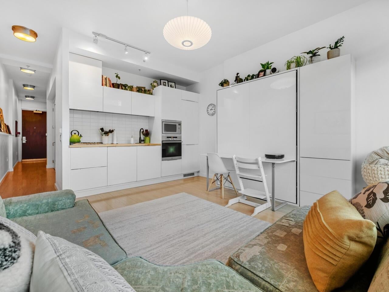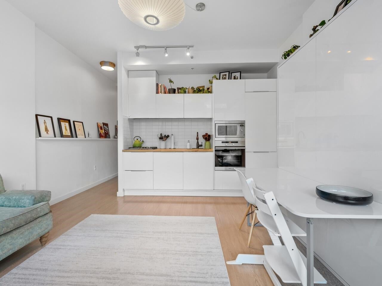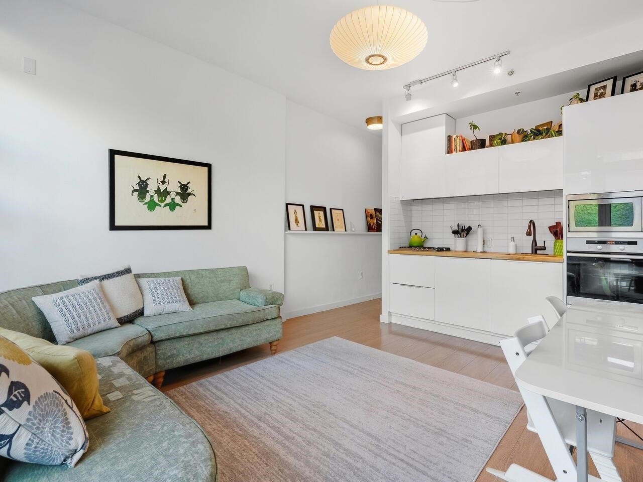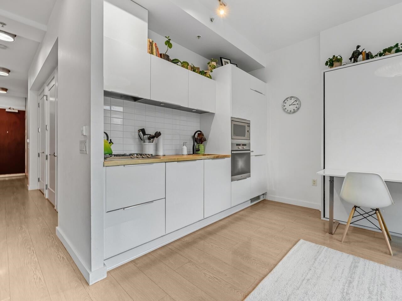 Compass in Olympic Village. The Condo - Great layout with bedroom and walk-in closet with custom organizers. The kitchen has been updated with high gloss cabinetry and butcher block countertop, Meile appliances, gas cooktop, and wall oven. Contemporary laminate flooring, nearly 10 foot ceilings, and a private outlook toward Craft Brewing (The historic Vancouver Salt Co). Peak at the water from the spacious patio. The Location - steps to the seawall, shops, theatres, coffee, and some of Vancouver's best seaside dining. The Building - leed certified, with open breezeways, radiant heating and cooling, and access to the world class amenities at The Gold Club for swimming, whirlpool, sauna, and a fully equipped fitness centre. Pets OK, secure parking (including for visitors) and storage locker.