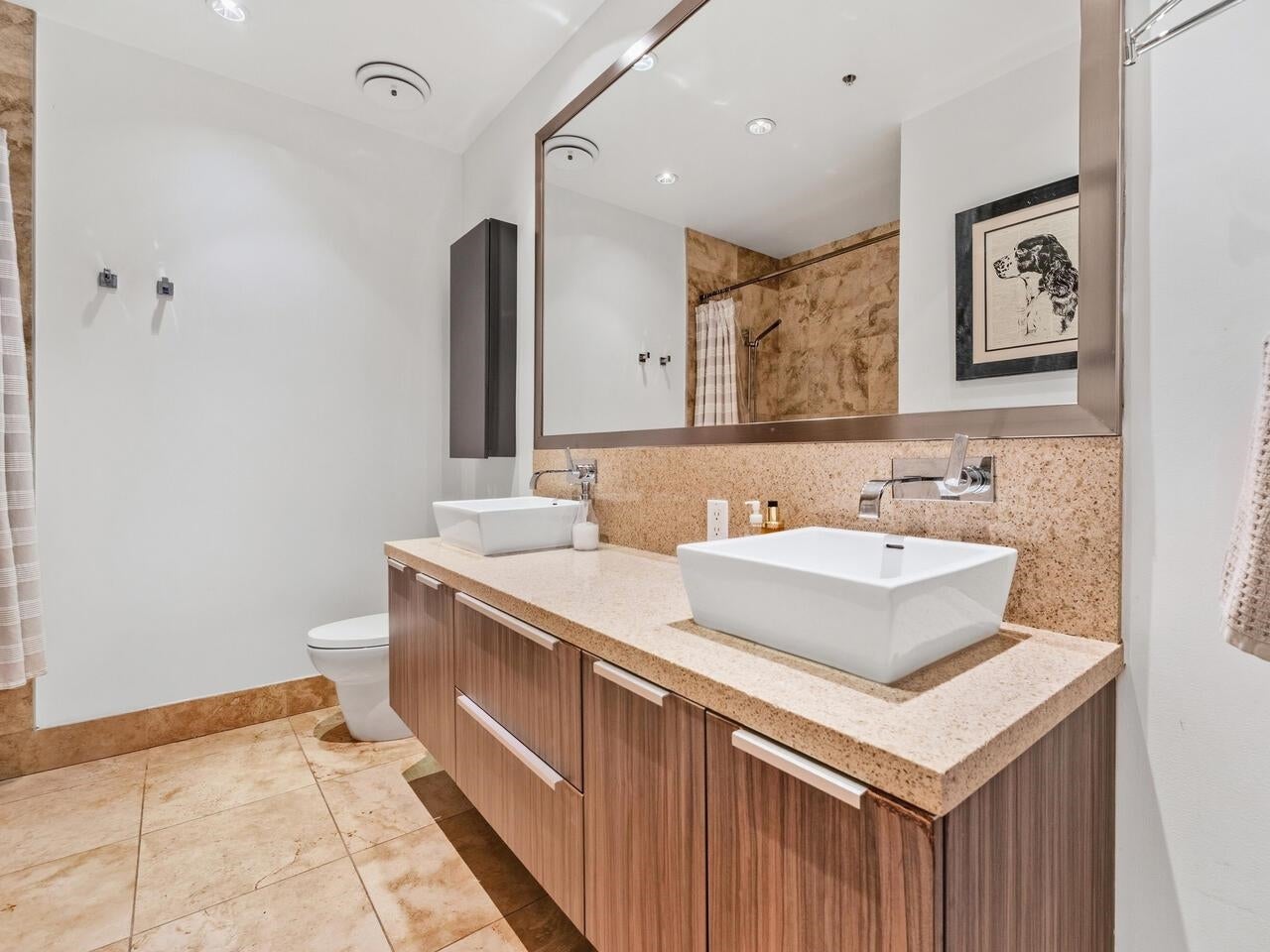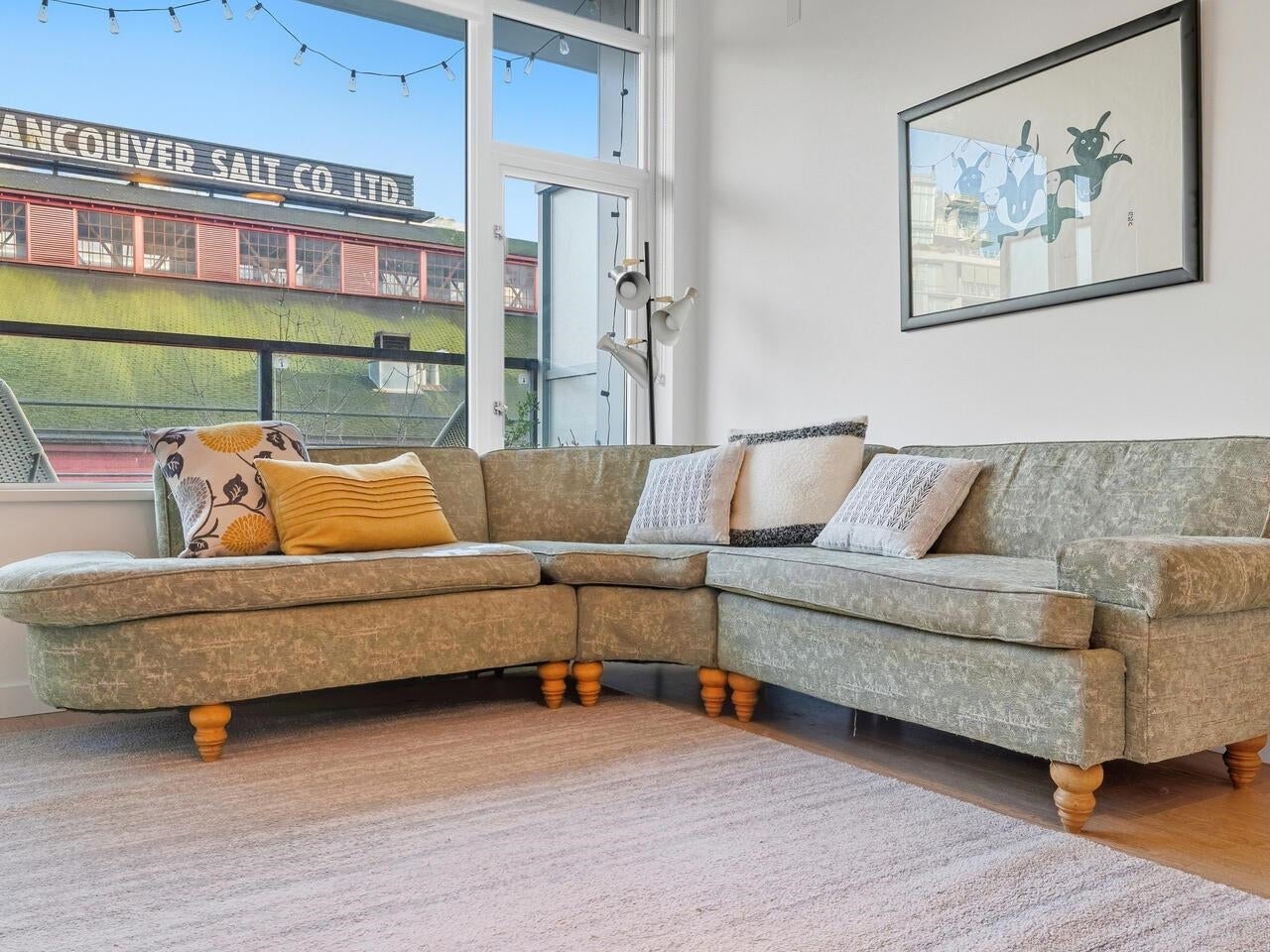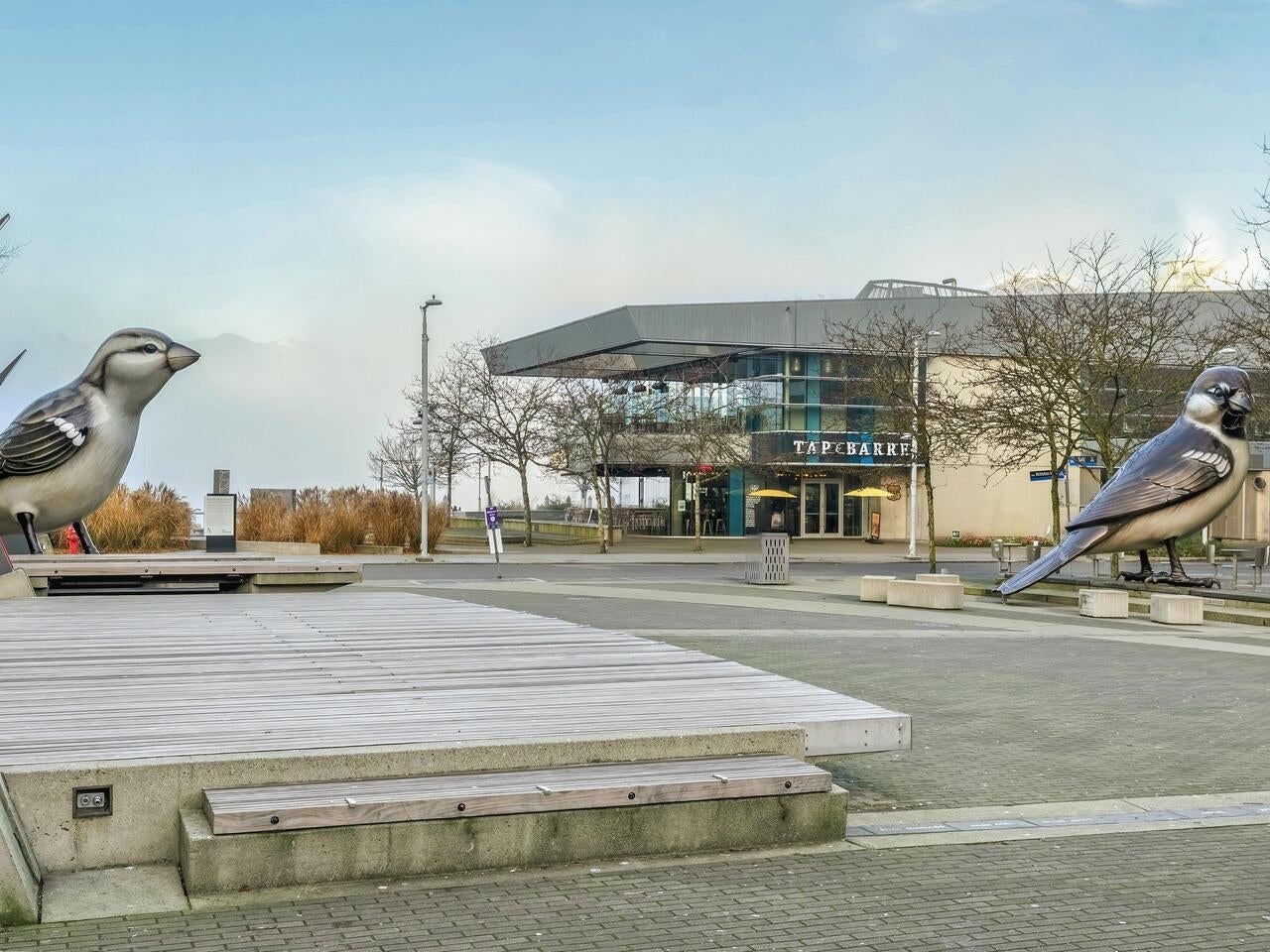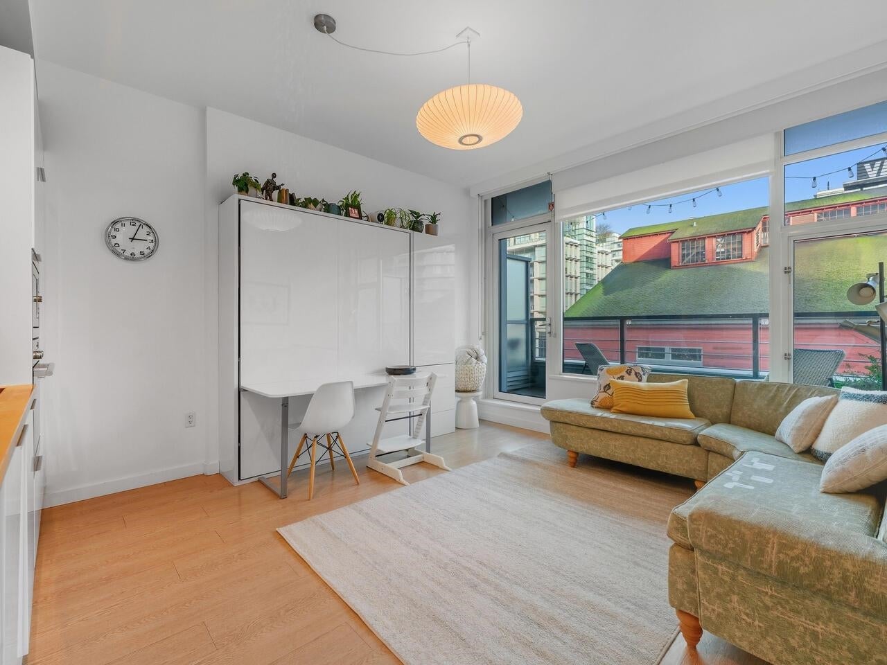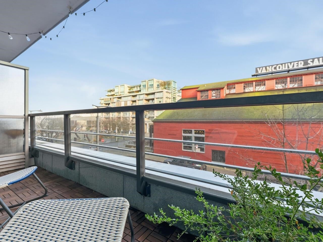 Compass in Olympic Village. The Condo - Great layout with bedroom and walk-in closet with custom organizers. The kitchen has been updated with high gloss cabinetry and butcher block countertop, Meile appliances, gas cooktop, and wall oven. Contemporary laminate flooring, nearly 10 foot ceilings, and a private outlook toward Craft Brewing (The historic Vancouver Salt Co). Peak at the water from the spacious patio. The Location - steps to the seawall, shops, theatres, coffee, and some of Vancouver's best seaside dining. The Building - leed certified, with open breezeways, radiant heating and cooling, and access to the world class amenities at The Gold Club for swimming, whirlpool, sauna, and a fully equipped fitness centre. Pets OK, secure parking (including for visitors) and storage locker.