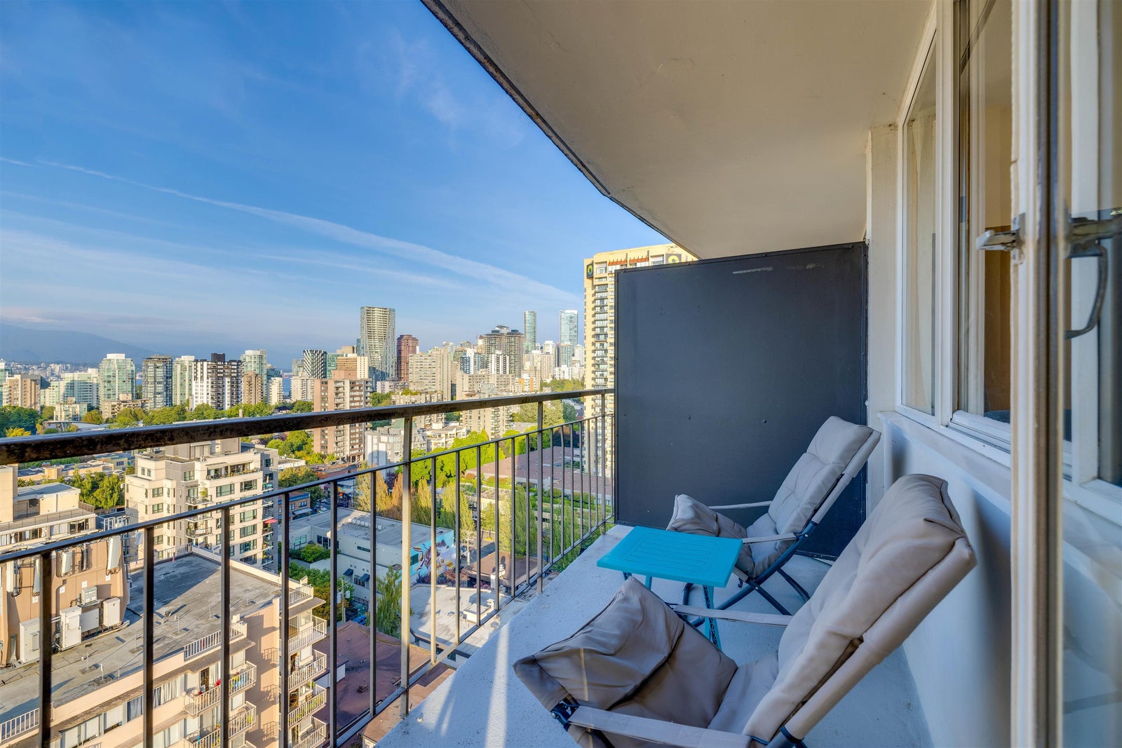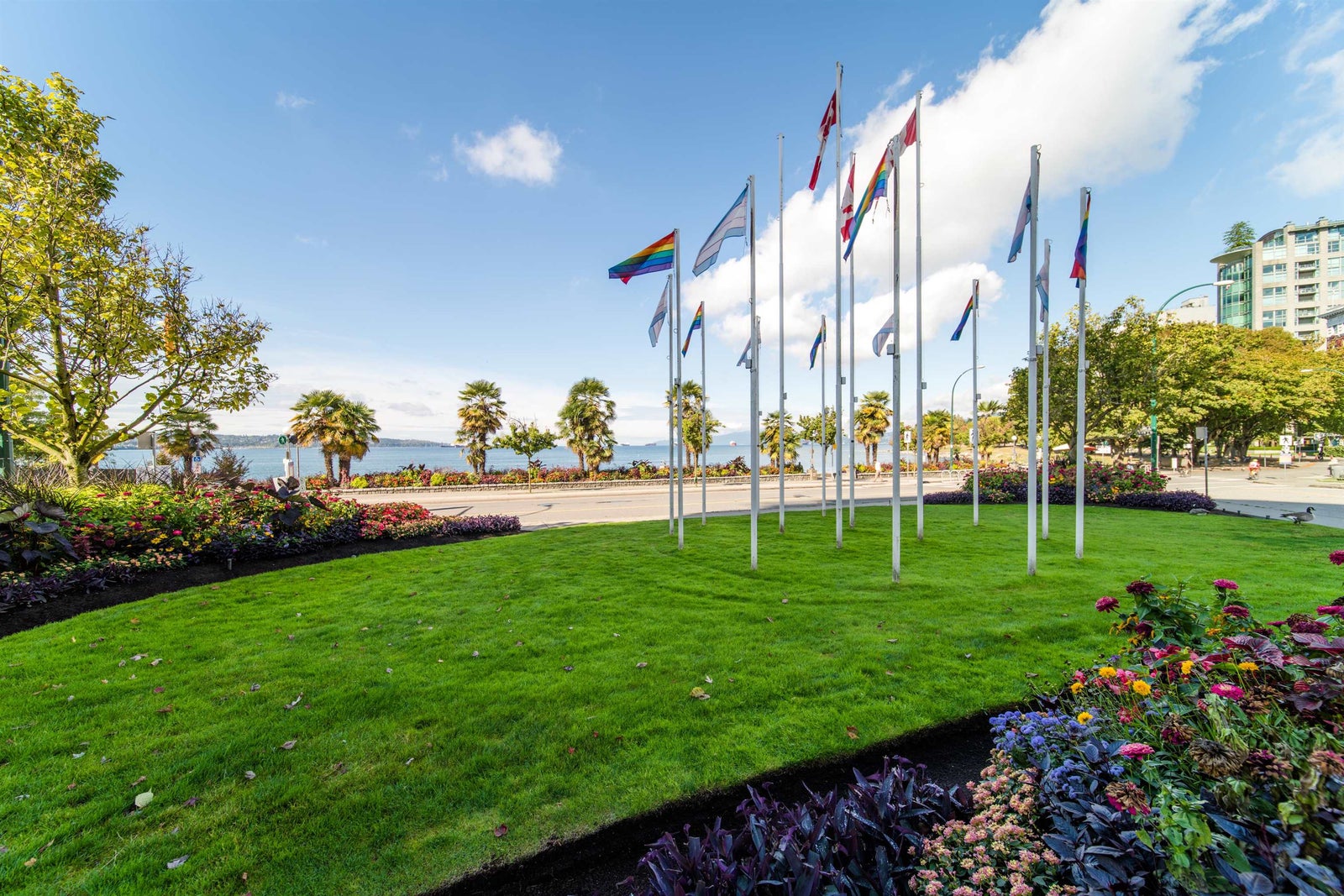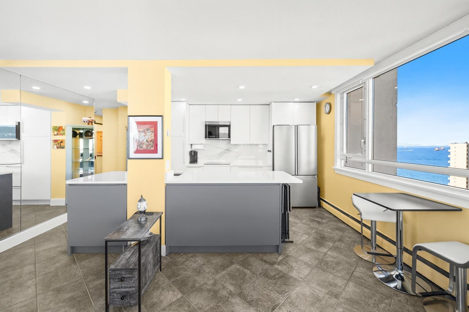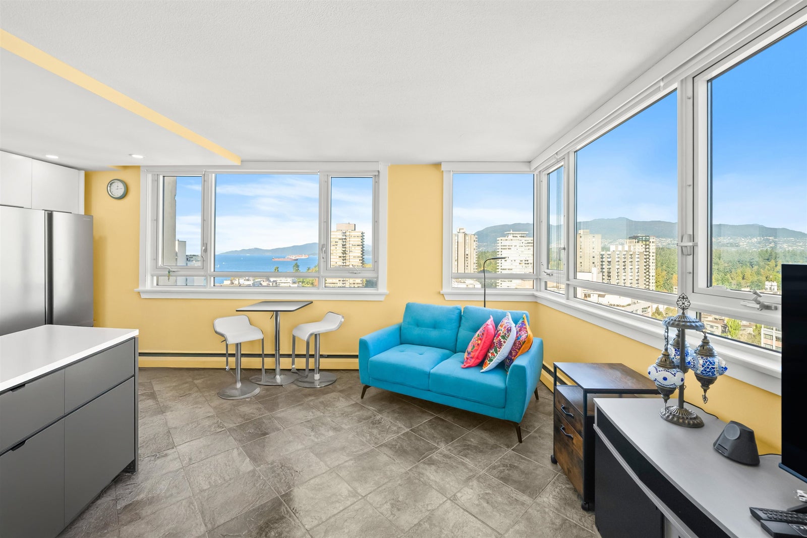West of Denman! Bright 20th-floor corner suite with unobstructed ocean, mountain & city views from every window. NW exposure fills the home with natural light, ocean breezes & year-round sunsets. Extensive updates include a sleek high-gloss kitchen with quartz counters, new induction oven &S/S appliances. Be part of the unparalleled West End community, with beach, Stanley Park, pools, local shops & global eats on Denman Street at your doorstep. Well-managed concrete building with major upgrades complete, including roof, plumbing, pool & lobby, plus a rooftop lounge with 360° views. No Empty Homes Tax. Maint. fee includes taxes, heat, hot water & amenities. Lease prepaid to Dec 31, 2073. FURNITURE INCLUDED.